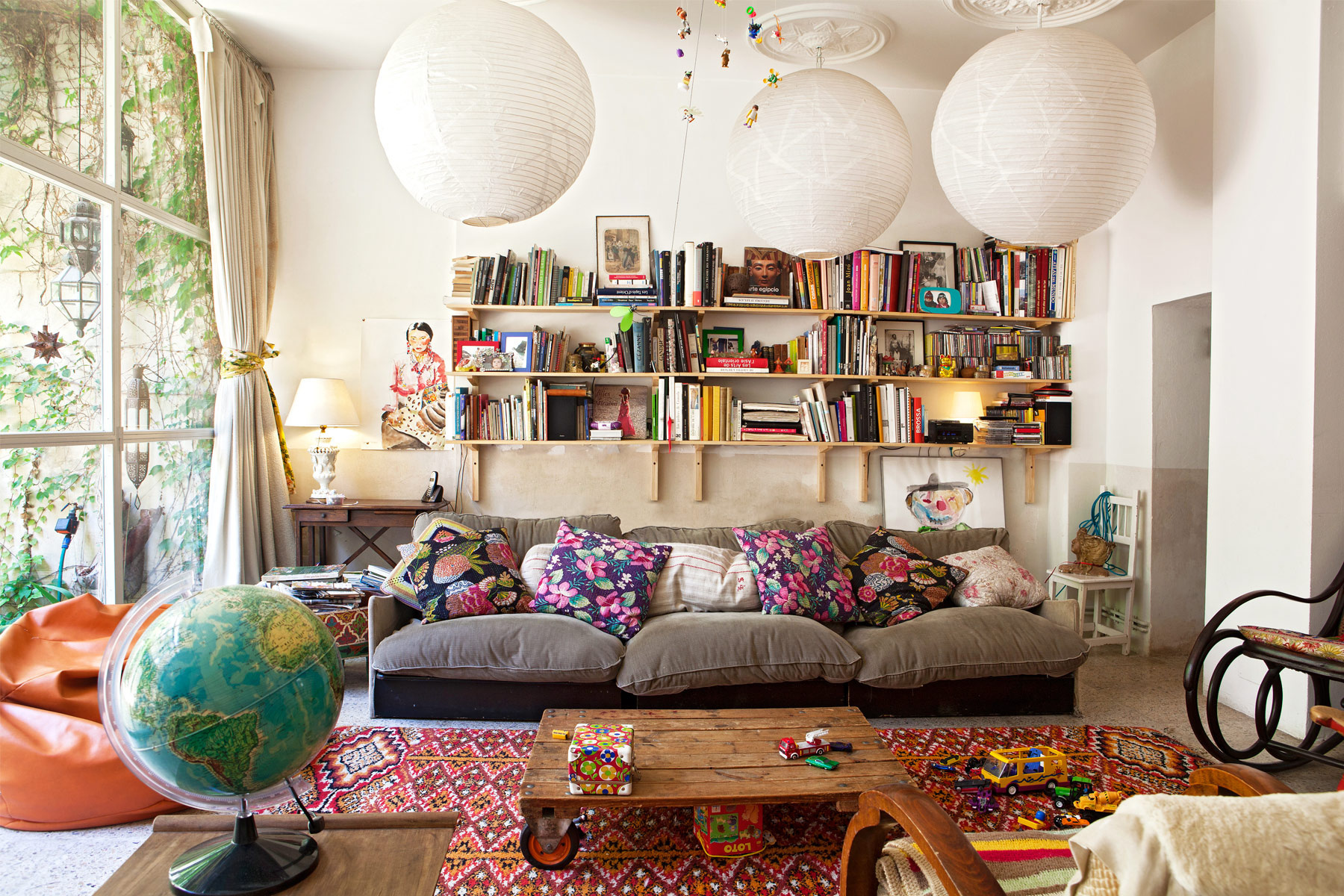 Me ha llamado la atención especialmente la mecedora y el palé, un elemento que cada vez más va ganando posiciones en casa. Todo es reutilizado: Una maravilla. Sin miedo a mezclar.