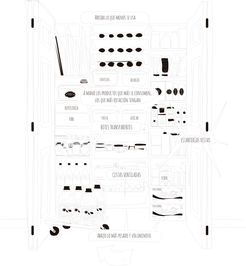 - Despensa para alimentos secos, latas, botellas, pastas, etc