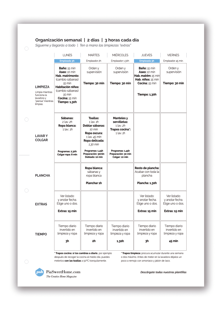 Esta plantilla se detiene, al igual que las otras dos, en la Organización del trabajo de la ayudante doméstica. Distribuir bien la jornada te ayudará a cubrir las necesidades de limpieza, plancha y ropa.